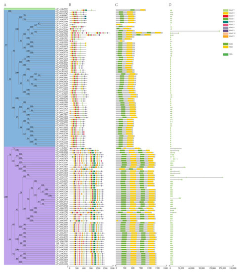 The schematic diagram of phylogenetic tree (A), conserved motif (B), domain (C) and exon/intron construction (D) of 124 ABCG members in G. hirsutum. (A) A total of 124 ABCGs in G. hirsutum were clustered into 3 clades shown in green, blue and purple, respectively. (B) and (C) The motifs or domains are indicated by colored boxes correspondingly. (D) The exon and intron of ABCGs are denoted by green box and gray line.
