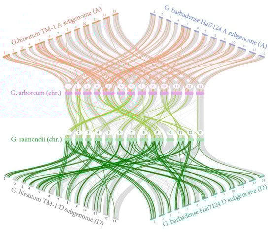 Collinear analysis of ABCGs among G. hirsutum, G. barbadense, G. arboreum and G. raimondii. Gray lines in the background indicate the collinear blocks and the colored lines highlight the syntenic ABCG gene pairs.