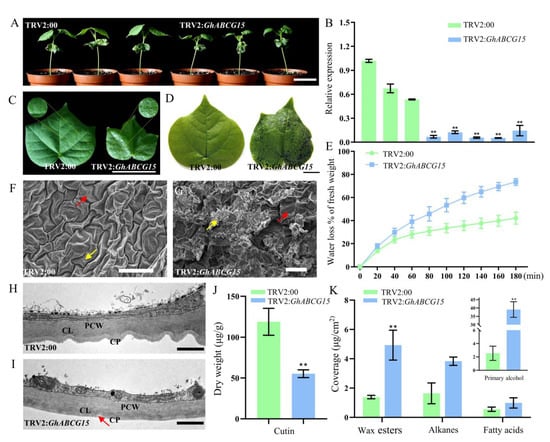 The phenotype and cuticular composition of GhABCG15-silenced plant leaves. (A) The phenotype of the cotton seedlings after GhABCG15 was silenced by VIGS for 10 days. TRV2:00 and TRV2:GhABCG15 represent control plants injected with empty vector and GhABCG15-silenced plants injected with GhABCG15 fragments (similarly hereinafter). Scale bar represents 5 cm. (B) The GhABCG15 expression levels in the leaves of control plants and GhABCG15-silenced plants were detected using qRT-PCR (Mean ± SD, n = 3; Student’s t-test, ** p < 0.01). (C) Leaf morphology observation of control and GhABCG15-silenced cotton seedlings, scale bar represents 4 cm. (D) Toluamide-blue staining of the whole leaves of control and GhABCG15-silenced cotton. Scale bar represents 1 cm. (E) Water loss rate detection of the detached leaves of control and GhABCG15-silenced cotton (Mean ± SD, n = 3). (F,G) show epidermal surface of control and GhABCG15-silenced leaves respectively obtained by scanning electron microscopy. Red arrow shows cuticular ridges and yellow arrow indicates epicuticular wax. Scale bars represent 50 μm. The cuticle ultrastructure of leaves cross-section of control (H) and GhABCG15-silenced cotton (I) were observed via transmission electron microscopy (TEM). Red arrow in H denotes the rupture point in cuticle structure of GhABCG15-silenced cotton. Scale bars in H and I represent 10 μm. (J) Cutin component quantification in control and GhABCG15-silenced cotton leaves (Mean ± SD, n = 3; Student’s t-test, ** p < 0.01). (K) Wax monomer components analysis in control and GhABCG15-silenced cotton leaves (Mean ± SD, n = 3; Student’s t-test, ** p < 0.01). CP: Cuticle Proper; CL: Cuticular Layer; PCW: Polysaccharide Cell Wall.