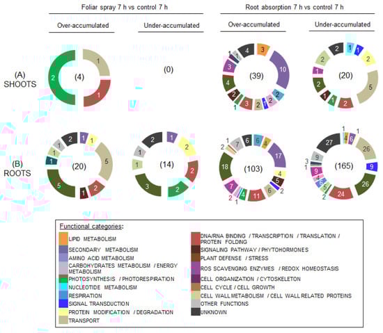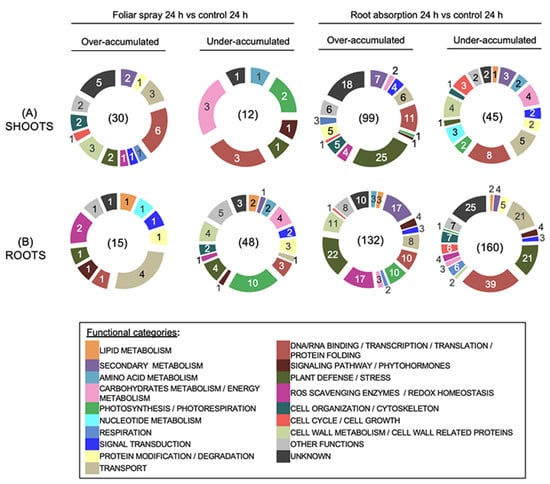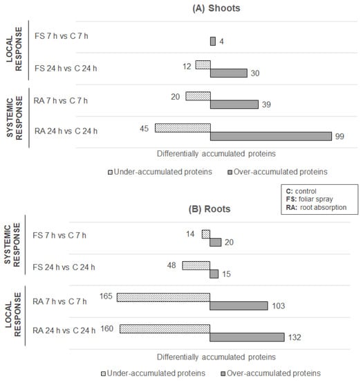 Specifically, in shoots, we found only 4 DAPs over-accumulated after 7 h of treatment by foliar spraying (Figure 1A) whereas after 24 h of treatment by foliar spraying, 42 DAPs were identified (12 DAPs under-accumulated and 30 DAPs over-accumulated). After RL application on roots, we found 59 (20 DAPs under-accumulated and 39 DAPs over-accumulated) and 144 DAPs (45 DAPs under-accumulated and 99 over-accumulated) at, respectively, T 7 h and T 24 h in shoots. Thus, RL application on roots had a larger impact on protein abundance in shoots compared to foliar spraying. Interestingly, modifications of protein abundance were already greater after 7 h of RL treatment by root absorption (59 DAPs) compared to foliar spraying at T 24 h (42 DAPs), further highlighting the minor local response induced by foliar spray of RLs in shoots.