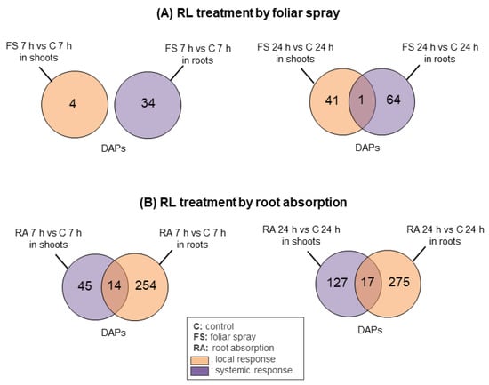 Venn diagrams of differentially accumulated proteins (DAPs) in shoots and roots of B. napus var. Darmor-bzh treated with RLs versus control. Four RL treatment conditions were tested: foliar spray treatment (A) and root absorption treatment (B), during 7 h or 24 h. These experiments were performed on three biological replicates.
