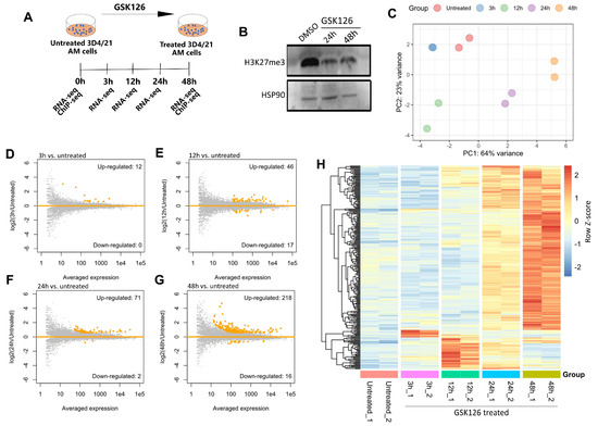 Global transcriptomic alterations in porcine alveolar macrophages after EZH2 inhibition. (A) Scheme for the GSK126 treatment of the porcine 3D4/21 AM cells and subsequent experiments. (B) Western blot shows the reduction in global H3K27me3 abundance after treatment of the 3D4/21 AM cells with the EZH2 inhibitor GSK126. HSP90 in the bottom panel was used as control. (C) PCA plot based on transcriptomic data shows the relationship between different samples. (D–G) MA plots show the transcriptional alteration after different time periods (i.e., 3h, 12h, 24h, 48h) of GSK126 treatment. (H) Heatmap shows the expression pattern of the upregulated genes at different times (i.e., 3h, 12h, 24h, 48h) after GSK126 treatment.
