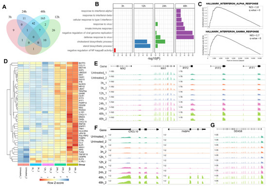 Transcriptional activation of numerous immune-related genes in porcine alveolar macrophages after EZH2 inhibition. (A) Venn diagram shows the overlap of the upregulated genes in 3D4 cells after treatment with GSK126 for different time periods. (B) GO enrichment for upregulated genes identified at different time points. The top 10 GO terms from the category “Biological Process” were visualized. (C) GSEA result for the significantly upregulated genes after treatment with GSK126 for 48 h. Only the top two enriched gene sets were visualized. The normalized enrichment score (NES) and q-values are indicated. (D) Expression profile for the immune-related genes that are upregulated after 48 h of treatment. The immune-related genes were selected based on the GO enrichment analysis results. (E–G) IGV tracks show the expression changes of representative genes related to antiviral effect (MX1, MX2, IFIT1, IFIT2, IFIT3), cytokine expression (CXCL10, FABP4), and RIG-I pathway (DDX58).