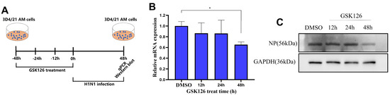 AMs are not only the key players of the first defense line against respiratory pathogens, but also the targets for respiratory pathogen infections [1,6]. Since inhibition of EZH2 promotes the activation of numerous immune genes in 3D4/21 AMs, we further examined how it would affect the infection by influenza A virus (IAV), which is a negative-stranded RNA orthomyxovirus. We treated 3D4/21 cells with GSK126 for different time periods (12, 24, 48 h) and then subjected the treated and untreated cells to H1N1 IAV infection, with all the samples being collected after 48 h of infection for further analysis (Figure 3A). We first performed qRT-PCR to examine the abundance of the M gene of IAV (Table S5) and found that its expression abundance is significantly decreased in the cells pre-treated with GSK126 for 48 h (Figure 3B). Furthermore, Western blotting confirmed that the nucleoprotein (NP) protein abundance of IAV is also remarkably decreased in the cells pre-treated with GSK126 for 48 h (Figure 3C). These results are in line with the activation of immune genes in 3D4/21 AMs after EZH2 inhibition, and they indicate that the antiviral state of AMs can be remarkably enhanced after inhibition of EZH2.