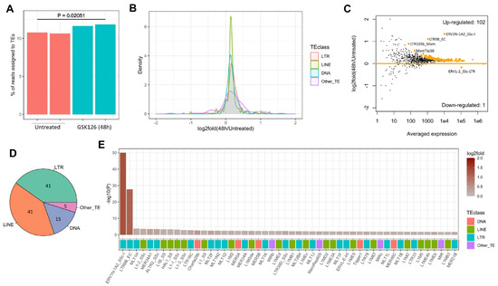 Global derepression of transposable elements in porcine 3D4 cells after EZH2 inhibition. (A) Percentages of reads assigned to TEs in 3D4 cells with or without GSK126 treatment (48 h). p-value calculated by using two-sided Student’s test is indicated. (B) Density plots compare the altered expression of different classes of TEs, including LTR, LINE, and DNA. (C) MA plot shows the altered expression of specific TE families after EZH2 inhibition. TE families with significantly altered expression (P < 0.05) are highlighted in orange color. (D) Pie chart shows the proportions of significantly upregulated TE families that belong to each TE class. (E) Barplot shows the top 50 significantly upregulated TE families. The color gradient indicates the log2fold expression after EZH2 inhibition (48 h). The y-axis indicates the –log10(P). The colored bars at the bottom indicate the memberships of each TE family in the major TE classes, including DNA, LINE, and LTR.