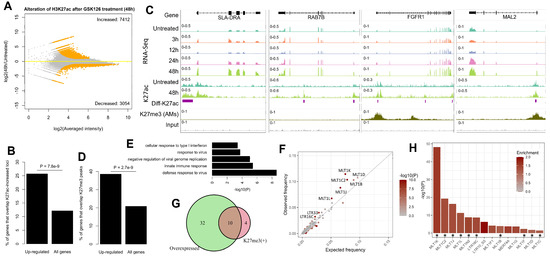 Epigenetic patterns for the activated genes and derepressed retrotransposons after the inhibition of EZH2. (A) MA plot shows the altered occupancy of H3K27ac after inhibition of EZH2 in porcine 3D4/21 AMs. The significant differential loci are indicated by orange color. (B) Barplot shows that H3K27ac-increased loci are overrepresented near upregulated genes. The two bars represent the percentages of genes (significantly upregulated genes vs. all genes) that overlap the loci with significantly increased H3K27ac intensity. An H3K27ac-increased peak was considered to overlap a gene if it fell within +/- 1 kb of the corresponding transcription start site (TSS). p-value calculated by using binomial test is indicated. (C) Integrative Genomics Viewer (IGV) tracks show the differential expression and differential H3K27ac occupancy after inhibition of EZH2 on representative genes, including SLA-DRA, RAB7B, FGFR1, and MAL2. H3K27me3 mark for porcine AMs is also indicated. Loci with significantly altered intensity of H3K27ac (abbreviated as Diff-K27ac) between GSK126-treated (48h) and untreated 3D4/21 AMs are indicated as purple bars in the IGV tracks. (D) Barplot shows that the upregulated genes after inhibition of EZH2 are more likely to overlap H3K27me3 peaks. The two bars represent the percentages of genes (significantly upregulated genes vs. all genes) that locate within H3K27me3 domains. A gene was considered to be within an H3K27me3 domain if its TSS overlaps any H3K27me3 peaks. p-value calculated by using binomial test is indicated. (E) Top five GO terms enriched within upregulated genes that are out of H3K27me3 domains. (F) Scatter plot shows the enrichment of specific ERV families within H3K27me3 domains. (G) Venn diagram shows the overlap of the ERV families upregulated after inhibition of EZH2 and overrepresented within H3K27me3 domains. (H) ERV families that are significantly enriched within H3K27me3 domains. Those also upregulated after inhibition of EZH2 are indicated by stars at the bottom.
