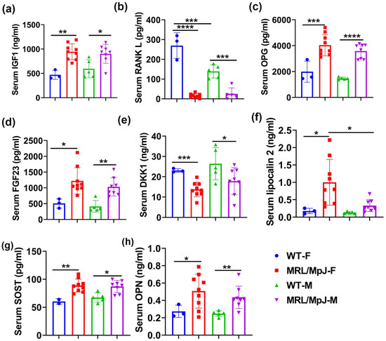 Multiplex analyses using the Luminex system were also performed. Osteoprotegerin (OPG), a decoy receptor of RANKL, was significantly higher in the serum of MRL/MpJ-F mice than in WT-F (p < 0.001). The OPG level was also significantly higher in the serum of MRL/MpJ-M mice than in the serum of the WT-M mice (p < 0.0001) (Figure 4c). Fibroblast growth factor 23 (FGF23) is a bone-derived hormone that regulates blood phosphate by increasing its renal excretion and by decreasing the renal production of 1,25-dihydroxyvitamin D3 [32]. FGF23 was significantly increased in the sera of both MRL/MpJ-F and MRL/MpJ-M mice compared to WT-F mice (p < 0.05) and WT-M mice (p < 0.01), respectively. (Figure 4d). Dickkopf-1(DKK1) is a Wnt signaling inhibitor [33]. DKK1 was significantly lower in the serum of MRL/MpJ-F and MRL/MpJ-M mice than their WT counterparts (p = 0.001 and p < 0.05, respectively) (Figure 4e). Serum lipocalin 2 was significantly higher in MRL/MpJ-F mice than in WT-F mice (p < 0.05), as well as in MRL/MpJ-M mice (p < 0.05) (Figure 4f). SOST was significantly higher in the serum of MRL/MpJ-F mice than in the serum of WT-F mice (p = 0.01). The SOST level was also significantly higher in the serum of MRL/MpJ-M mice than in the serum of the WT-M mice (p < 0.05) (Figure 4g). Serum osteopontin (OPN) levels in both MRL/MpJ-F and MRL/MpJ-M mice were significantly higher than their WT counterparts (p < 0.05 and p < 0.01, respectively). No statistical differences between any groups for other factors measured were found.