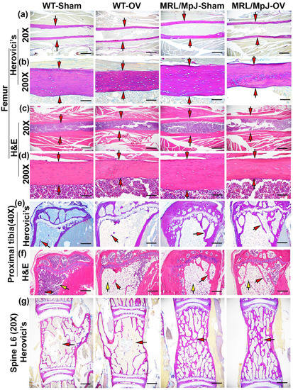 Histology at 6 M after ovariectomy or sham surgery. (a,b) Herovici’s staining of femoral cortical bone at 20× and 200× magnification. At 20× magnification, both WT-OV and MRL/MpJ-OV showed a relatively thinner collagen type 1 (COL1) matrix compared to WT-Sham and MRL/MpJ-Sham, respectively (pink-red), as indicated by red arrows. Scale bars = 1 mm. At 200× magnification, all groups showed a highly organized pink-red COL1 matrix. WT-OV and MRL/MpJ-OV demonstrated obviously thinner cortical bone than WT-Sham and MRL/MpJ-Sham, respectively, as demonstrated by red arrows. Scale bar = 100 μm. (c,d) H&E staining of femoral cortical bone at 20× and 200×. At 20×, WT-OV and MRL/MpJ-OV mice both exhibited relatively thinner femoral cortical bone compared to the WT-Sham and MRL/MpJ-Sham groups as indicated by red arrows, respectively. Scale bars = 1 mm. At 200× magnification. Both WT-OV and MRL/MpJ-OV showed obviously thinner femoral cortical bone, as indicated by red arrows. Osteocytes were well-organized. Scale bars = 100 μm. (e) Herovici’s staining of proximal tibia trabecular bone. WT-OV mice lost almost all pink-red-stained COL1-positive trabecular bone, while WT-Sham mice only had minimally pink-stained trabecular bone remaining, as shown by red arrows. In contrast, MRL/MpJ-OV maintained more trabecular bone, which was similar to MRL/MpJ-Sham mice. Scale bars = 500 μm. (f) H&E staining of the proximal tibia. WT-OV mice showed almost no trabecular bone and large amounts of adipose tissue (empty space with flat nuclei) occupying the bone marrow cavity compared to scattered adipose cells in the WT-Sham mice. MRL/MpJ-OV and MRL/MpJ-Sham both showed more trabecular bone than WT-Sham and WT-OV mice but large amounts of adipose tissue were also observed in both MRL/MpJ-Sham and MRL/MpJ-OV mice. Red arrows indicate trabecular bone while yellow arrows indicate fat cells. Scale bars = 500 μm. (g) Herovici’s staining of spine L6. The pink-red-stained trabecular bones in WT-OV mice were slightly more sparse and thinner than the WT-Sham. On the contrary, MRL/MpJ-Sham and MRL/MpJ-OV showed significantly denser pink-red-stained COL1-positive trabecular bone than WT-Sham and WT-OV with no obvious differences between the MRL/MpJ-OV and MRL/MpJ-Sham groups. Red arrows indicate trabecular bones. Scale bars = 1 mm.