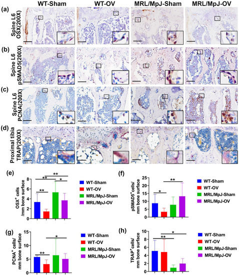 TRAP staining was further utilized to identify osteoclasts in the proximal tibia trabecular bone. TRAP+ cells were stained violet-red on the bone surface with single or multiple nuclei. The WT-OV and MRL/MpJ-OV mice did not show any significant differences in the number of TRAP+ cells compared to their sham counterparts. However, the MRL/MpJ-Sham and MRL/MpJ-OV mice showed significantly lower TRAP+ cells on the bone surface compared to their WT counterparts (p < 0.01 and 0.05, respectively) (Figure 8d,h). TRAP staining was also performed for the vertebral tissues where very few TRAP+ cells were identified on the spine trabecular bone with no differences between any groups.