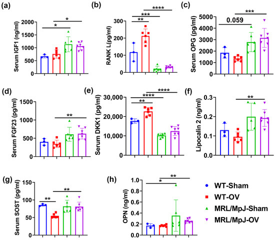 ELISA demonstrated that the IGF1 level in the MRL/MpJ-Sham group was significantly higher than that of the WT-Sham (p < 0.05). The IGF1 level was also significantly higher in the MRL/MpJ-OV group than in the WT-OV group (p < 0.05) (Figure 9a). Regarding RANKL, the WT-OV mice showed significantly higher serum RANKL levels compared to the WT-Sham mice (p < 0.01), while the MRL/MpJ-OV mice did not show significant differences in RANKL levels after ovariectomy. The MRL/MpJ-Sham mice showed significantly lower serum RANKL levels than the WT-Sham mice (p < 0.001). The MRL/MpJ-OV mice also showed significantly lower levels of RANKL as compared to WT-OV mice (p < 0.0001) (Figure 9b). The multiplex assay results demonstrated that serum OPG in the MRL/MpJ-Sham mice was higher than in the WT-Sham (p = 0.059). The serum OPG level in the MRL/MpJ-OV mice was also significantly higher than in the WT-OV mice (p < 0.001) (Figure 9c). MRL/MpJ-OV also showed significantly higher levels of FGF23 than the WT-OV mice (p < 0.01), while no differences were found between other groups (Figure 9d). The DKK1 level was found to be significantly increased in the WT-OV mice compared to the WT-Sham mice (p < 0.01). However, the serum DKK1 level was significantly lower in the MRL/MpJ-Sham mice compared to the WT-Sham (p < 0.0001). The DKK1 level of the MRL/MpJ-OV mice was also significantly lower compared to the WT-OV mice (p < 0.0001) (Figure 9e). The serum lipocalin 2 level in the MRL/MpJ-OV mice was significantly higher than in the WT-OV mice (p < 0.01). Furthermore, the WT-OV mice showed significantly lower levels of SOST compared to the WT-Sham (p < 0.01); however, the serum SOST level of MRL/MpJ-OV mice was significantly higher than that of WT-OV mice (p < 0.01) (Figure 9g). The serum OPN level in the MRL/MpJ-Sham mice was significantly higher than the level in the WT-Sham mice (p = 0.05). The OPN level in the MRL/MpJ-OV mice was significantly higher than that of the WT-OV mice (p < 0.01) (Figure 9h). No statistical differences were found between groups for other factors measured.