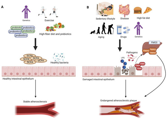 Different factors, such as the gut microbiome, diet, lifestyle, and genetics, play a major role in the development of atherosclerosis. (A) High-fiber diet, active lifestyle, and the intake of probiotics increase the abundance of beneficial gut bacteria and the amount of SCFAs, which support the tight junctions and protect the intestinal epithelium, thus preventing harmful metabolites from entering the circulation. This contributes to a stable atherosclerotic plaque. (B) High-fat diet, sedentary lifestyle, intestinal disease (e.g., Crohn’s disease, irritable bowel disease), the intake of different drugs (e.g., antibiotics), and aging lead to a disruption in the gut microbial profile, resulting in higher abundance of pathogenic bacteria and lower amounts of SCFAs. These effects lead to damage in the gut epithelium; thus, a leaky gut allows the translocation of LPS, TMA, and other damaging metabolites into the circulation. High amounts of plasma LPS and TMAO result in an endangered atherosclerotic plaque.