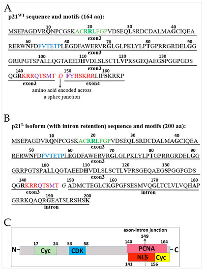 Comparison of the amino acid sequences and colour-highlighted motifs of the wild-type p21 and variant p21L isoforms. (A) Wild-type p21; 17–24: RxL motif cyclin binding site; 53–58: CDK binding domain; 140–164: PIP-box K + 4 motif (Qxx[M/L/I]xx[F/Y][F/Y]) proliferating cell nuclear antigen (PCNA) interaction site; 141–156: nuclear localization signal (NLS). (B) The p21L intron-retaining isoform of p21. The PCNA interaction site and nuclear localization domain are only partially present in the p21L isoform with intron retention between exons 3 and 4. (C) Representation of p21WAF1 protein with its protein-interacting domains; 149–200: novel C-terminal sequence.