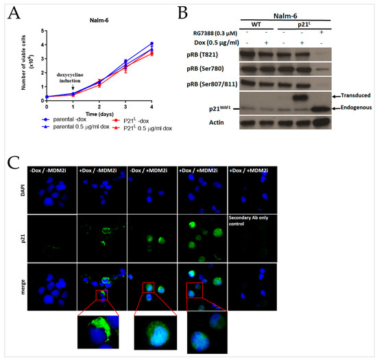 To provide a detailed characterization of the intracellular localization of the high molecular weight p21L protein, particularly to test the hypothesis that the p21L protein was unable to localise to the nucleus, the subcellular distribution of p21L was examined in Nalm-6–p21L transduced cells by immunofluorescence. In the Nalm-6–p21L transduced cells induced using 0.5 µg/mL doxycycline for 24 h to express high molecular weight p21L protein, the p21 signal was detected only in the cytoplasm of the cells. Treatment with the MDM2 inhibitor RG7388 (1 µM; 24 h), however, induced endogenous p21WAF1 expression and the p21WAF1 signal was detected in both cytoplasmic and nuclear compartments (Figure 3C).