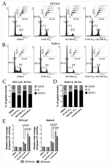 For Nalm-6 cells, unlike OCI-Ly3, treatment with E7107 alone resulted in a significant increase in G0/G1 phase (p = 0.019) and a decrease in the G2/M phase (p = 0.014). Treatment with RG7388 alone resulted in a significant increase in G0/G1 phase (p < 0.0001). E7107 treatment further decreased the proportion of cells in S phase when it was combined with RG7388 (Cells in S phase as % of total events treated with 1xIC50 RG7388 alone vs. combination with E7107 p = 0.002) (Figure 5B,D).