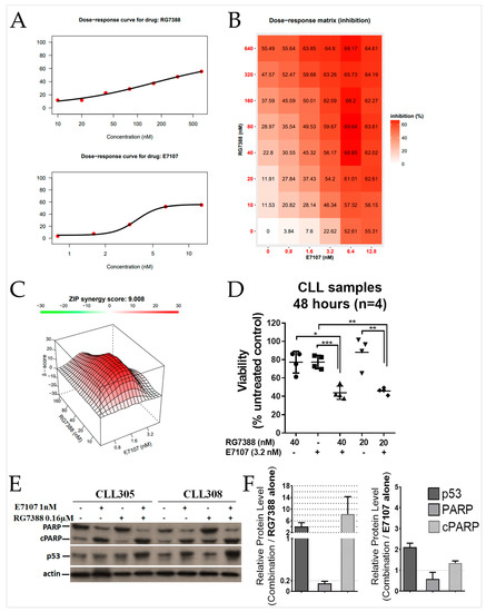 Synergistic effect of RG7388 and E7107 on primary CLL samples. (A) Dose-dependent inhibition of cell viability determined by XTT assay averaged for n = 4 patient CLL samples after 48 h ex vivo treatment. Curve fitting of the single drug dose-response data was performed using a four-parameter log-logistic function. (B) Dose-response matrix heat map showing % inhibition for a range of E7107 and RG7388 dose combinations. (C) The synergy heat map for drug combinations using the zero interaction potency (ZIP) model. (D) Viability as a percentage of the untreated control for n = 4 individual patient CLL samples after 48 h treatment with 3.2 nM E7107 and/or the indicated concentrations of RG7388. Significant differences were calculated by paired t-test (* p < 0.05; ** p < 0.01; *** p < 0.001). 20 nM RG7388 alone vs. combination with 3.2 nM E7107 p = 0.0091; 3.2 nM E7107 alone vs. combination with 20 nM RG7388 p = 0.0051; 40 nM RG7388 alone vs. combination with 3.2 nM E7107 p = 0.010; 3.2 nM E7107 alone vs. combination with 40 nM RG7388 p = 0.0008. (E) Western blot analysis of full-length/cleaved-PARP and p53 proteins 24 h after the commencement of treatment with 0.16 µM RG7388 or 1 nM E7107, or the combination of both for two patient CLL samples (CLL305 and CLL308). (F) Densitometry analysis of p53, PARP, and cPARP shows the normalized changes to the loading control, actin. Error bars show the mean with range (n = 2).