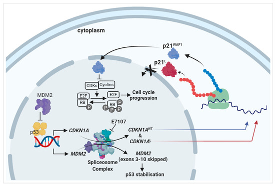Proposed mechanism for the effect of spliceosome inhibition by E7107 on the p53 pathway and synergy with MDM2 inhibitors. E7107 forces the spliceosome complex to malfunction and produce aberrant products. Reduced full-length MDM2 production due to exon skipping results in enhanced stabilization and the activation of p53. Nuclear p53 induces more CDKN1A transcription, but some of these transcripts are subject to aberrant splicing, in this case in the form of intron retention generating a long form of p21 (p21L). Wild-type p21WAF1 localises to the nucleus to function as a cyclin-dependent kinase inhibitor to arrest the cell cycle. Altered p21 (p21L) protein with an alternative C-terminus, however, loses its ability to act as a cyclin-dependent kinase inhibitor due to the loss of the ability to localise to the nucleus. This loss of the protective effect of normal p21 against apoptosis contributes to the sensitization of the cells to the enhanced p53 stabilisation and p53-dependent proapoptotic signals resulting from the combined effect of MDM2–p53 binding antagonists and MDM2 exon skipping due to E7107 treatment.