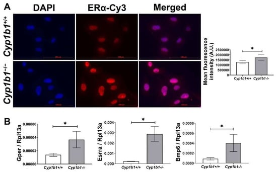 Cytochrome P450 1B1-deficient (Cyp1b1−/−) retinal ECs exhibit increased ERα nuclear localization and ERα-mediated gene expression. (A) The nuclear localization of ERα was determined by indirect immunofluorescence staining. Images were captured in digital format (left panel, scale bars = 100 µm). Integrated fluorescence intensities of images were measured and normalized by cell number for quantitative analysis (right panel). Cyp1b1−/− retinal ECs showed significantly increased nuclear localization of ERα (* p < 0.05; n = 5). (B) qPCR analysis confirmed enhanced expression of ERα-downstream target genes, including G-protein-coupled ER (Gper), estrogen-related receptor alpha (Esrra), and bone morphogenetic protein 6 (Bmp6) (* p < 0.05; n = 3).