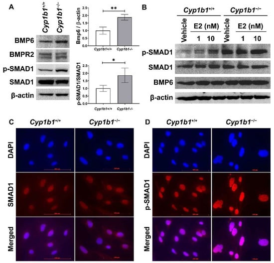 We next examined the levels of proteins involved in the BMP6 signaling pathway via Western blot analysis. Both Cyp1b1+/+ and Cyp1b1−/− retinal ECs expressed BMP receptor type II (BMPRII), the receptor to which BMP6 binds with high affinity []. SMAD1, 5, and 8 are transcription factors and the major intracellular mediators of BMP signaling [], and phosphorylated by BMP receptors in a ligand-dependent manner, translocating into the nucleus []. Cyp1b1−/− retinal ECs exhibited enhanced SMAD1 phosphorylation levels compared with Cyp1b1+/+ retinal ECs (Figure 2A). We also assessed whether E2 can induce BMP6 expression and/or activate its downstream signaling pathway in Cyp1b1+/+ retinal ECs. Cyp1b1+/+ and Cyp1b1−/− retinal ECs were incubated with E2 (1 or 10 nM) for 24 h and cell lysates were prepared for Western blot analysis. Figure 2B shows incubation of retinal ECs with E2 increased BMP6 protein levels and SMAD1 phosphorylation in Cyp1b1+/+ ECs, while the basal levels of these proteins were elevated in Cyp1b1−/− ECs with or without E2. Further, we performed indirect immunofluorescence staining to determine the cellular localization of phosphorylated SMAD1 (p-SMAD1) and total SMAD1. As shown in Figure 2C,D, pSMAD1 nuclear localization was enhanced in Cyp1b1−/− and Cyp1b1+/+ retinal ECs.