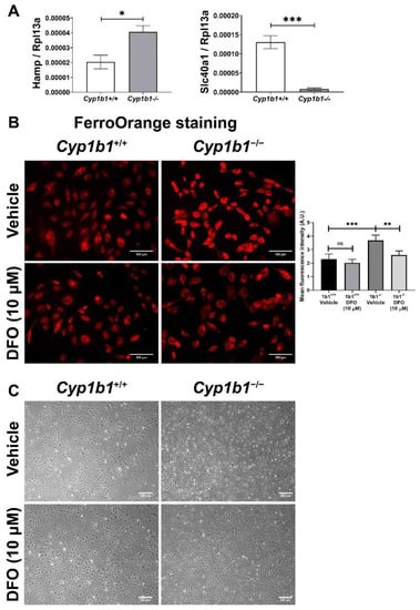Intracellular iron levels are upregulated in Cyp1b1−/− retinal ECs. (A) The expression levels of Hamp (gene encoding hepcidin) and Slc40a1 (gene encoding ferroportin) in Cyp1b1+/+ and Cyp1b1−/− retinal ECs were assessed by qPCR analysis (* p < 0.05, *** p < 0.001; n = 3). (B) Cyp1b1+/+ and Cyp1b1−/− retinal ECs were incubated with 10 µM DFO for 48 h. Intracellular iron levels were determined by staining with FerroOrange. The cells were imaged using a fluorescence microscope (scale bars = 100 µm), images captured in a digital format, and mean fluorescence intensities were obtained using ImageJ (** p < 0.01, *** p < 0.01; n = 5; ns: not significant). (C) Cyp1b1+/+ and Cyp1b1−/− retinal ECs were incubated with 10 µM DFO for 24 h and the cells were photographed using a phase microscope (scale bars = 250 µm). Please note iron chelation in Cyp1b1−/− cells restores a more similar morphology to Cyp1b1+/+ cells.
