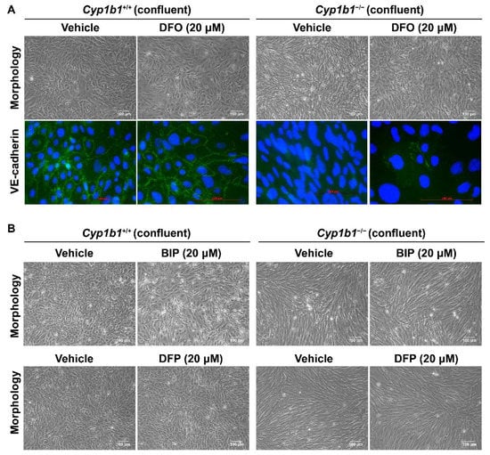 Altered confluent cell morphology and lack of VE-cadherin junctional localization in Cyp1b1−/− retinal ECs were partially restored by iron chelator DFO, and not by deferiprone (DFP) or 2,2’-Bipyridine (BIP). (A) Near-confluent (90%) Cyp1b1+/+ and Cyp1b1−/− retinal ECs were incubated with 20 µM DFO for 48 h. The cell morphology was assessed by phase microscopy and stained with anti-VE-cadherin antibody (labeled green) to determine the junctional localization of VE cadherin (scale bars = 100 µM). DAPI (blue) was used to stain the cell nuclei. Please note the partial restoration of morphology and VE-cadherin junctional localization in Cyp1b1−/− retinal ECs incubated with DFO. (B) Near-confluent (90%) Cyp1b1+/+ and Cyp1b1−/− retinal ECs were incubated with 20 µM BIP or DFP for 48 h. The cell morphology was assessed by phase microscopy and photographed in digital format (scale bars = 100 µM). Please note no dramatic changes in morphology of Cyp1b1−/− retinal ECs incubated with BIP or DFP.