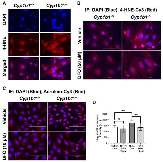 Upregulation of lipid peroxidation in Cyp1b1−/− retinal ECs. (A) Cyp1b1+/+ and Cyp1b1−/− retinal ECs were stained with anti-4-hydroxynonenal (4-HNE, red) antibody and DAPI (blue) to determine cellular 4-HNE levels (scale bars = 100 µm). (B) Cyp1b1+/+ and Cyp1b1−/− retinal ECs were incubated with 50 µM DFO for 24 h and stained with anti-4-HNE antibody and DAPI. (C) Cyp1b1+/+ and Cyp1b1−/− retinal ECs were incubated with 10 µM DFO for 48 h and stained with anti-acrolein antibody (red) and DAPI (blue) scale bars = 100 µm. (D) Acrolein staining intensities were measured using ImageJ for quantitative analysis (** p < 0.01; n = 10 for each group; ns: not significant).