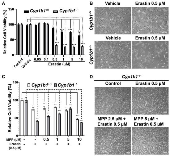 The increased cellular iron level and lipid peroxidation in Cyp1b1−/− retinal ECs suggest an enhanced rate of ferroptosis in these cells. Ferroptosis is a form of iron-dependent cell death characterized by excessive accumulation of lipid peroxides and ROS []. To compare ferroptosis sensitivity of Cyp1b1+/+ and Cyp1b1−/− retinal ECs, we incubated the cells with different concentrations (0.05–10 µM) of erastin for 24 h. Erastin induces ferroptosis through suppression of cysteine uptake via system Xc− []. Cell viability in response to erastin was analyzed via MTS assay and the results showed that erastin decreased cell viability in a dose-dependent manner. However, Cyp1b1−/− retinal ECs were more sensitive to Erastin (0.5 µM) incubation. Erastin reduced the viability of Cyp1b1−/− retinal ECs by 67.4%, while that of Cyp1b1+/+ retinal ECs was decreased by 11.2% (Figure 7A,B). Thus, Cyp1b1−/− retinal ECs were more susceptible to erastin-mediated ferroptosis compared with Cyp1b1+/+ retinal ECs.