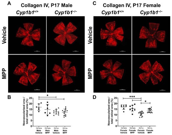 We previously reported the attenuation retinal neovascularization in Cyp1b1−/− mice during OIR []. CYP1B1 plays important roles in the modulation of ERα activity in retinal ECs, which impacts iron homeostasis and lipid peroxidation. Based on these observations, we next assessed the role ERα signaling plays in retinal neovascularization during OIR by administrating MPP to Cyp1b1+/+ and Cyp1b1−/− mice (1 mg/kg, IP injection, prepared in 50 µL of saline), once the mice were returned to room air (P12) until P17 (maximum neovascularization) []. Retinas from P17 mice were wholemount immunostained with anti-collagen IV. Retinal neovascularization was assessed by measuring the area of neovascular tufts and calculated as a percentage of the total retinal area. Consistent with our previous studies [,], P17 male and female Cyp1b1−/− mice showed reduced neovascularization compared to P17 male and female Cyp1b1+/+ mice (Figure 8A,C). We also found that female Cyp1b1−/− mice exhibit significantly less neovascularization than male Cyp1b1−/− mice at P17 (Figure 8C). ERα antagonism by MPP did not significantly affect retinal neovascularization in Cyp1b1+/+ mice (Figure 8B). However, MPP injection did restore retinal neovascularization in P17 female, but not in male, Cyp1b1−/− mice (Figure 8D).