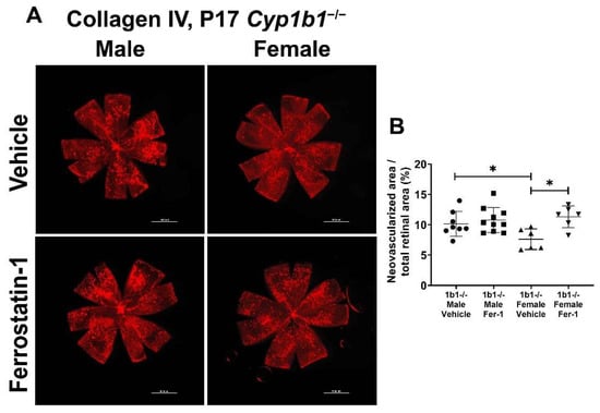 Ferrostatin-1 (Fer-1) administration restored retinal neovascularization in female but not male Cyp1b1−/− mice during OIR. Retinas from P17 Cyp1b1−/− mice that were administrated with Fer-1 (5 mg/kg, daily IP injection prepared in 50 µL saline, from P12-P17) during OIR were wholemount stained with anti-collagen IV antibody and imaged by fluorescent microscopy (A). Scale bars = 1000 µm. Quantitative assessment of the neovascularization was performed using ImageJ and the percentages of neovascular areas are shown in (B). (* p < 0.05; n ≥ 6; each point represents one retina).