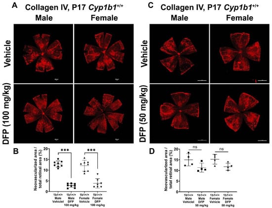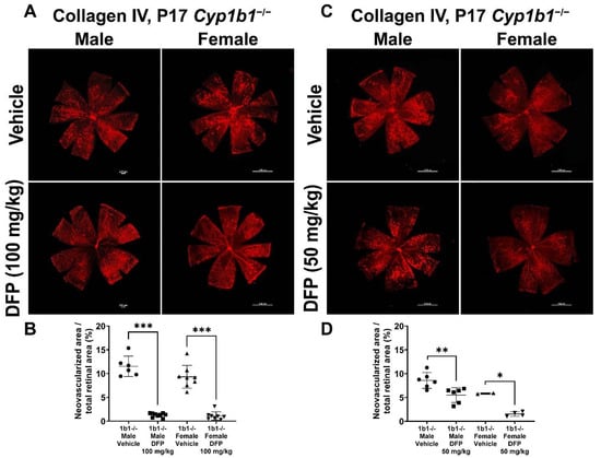 To further delineate the effect of iron chelation on retinal neovascularization, we used the iron chelator DFP. DFP and DFO are both Fe3+ chelators, but DFO is a randomly oriented linear molecule with a low membrane permeability []. DFP is a small hydroxypyridinone molecule with high membrane permeability (Figure S2), which suggests that DFP has the potential to be more effective than DFO in chelating iron []. DFP protects retinal degeneration in mice mediated by sodium iodate and intense light and is neuroprotective in a preclinical mouse model of glaucoma [,,]. Cyp1b1+/+ and Cyp1b1−/− mice were intraperitoneally administrated with 50 mg/kg or 100 mg/kg DFP every day from P12 to P17 during OIR. In Cyp1b1+/+ mice, 100 mg/kg DFP significantly downregulated neovascularization in male and female mice, but the effect of 50 mg/kg DFP in Cyp1b1+/+ mice was not significant (Figure 10). However, DFP significantly decreased neovascularization in both male and female Cyp1b1−/− mice, at both 50 and 100 mg/kg (Figure 11).