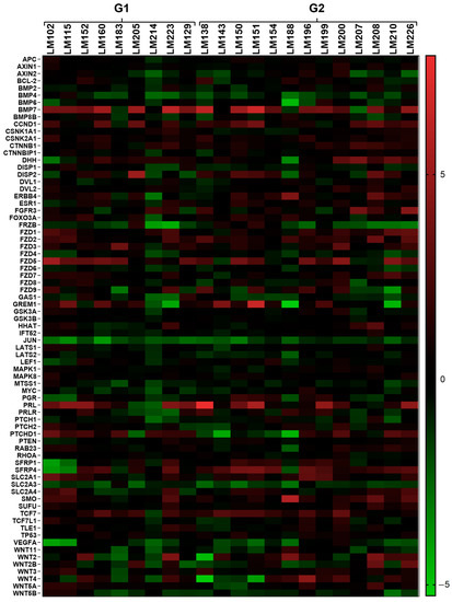 Using the open-array system (Taqman® detection method), we assessed the expression profile of 112 genes (including six endogenous controls) involved in several signaling pathways (WNT, SHH, MAPK, and others) and biological processes (cell apoptosis, proliferation, and others). Thirty-two genes were not detected in the RG, resulting in 75 genes observed using a non-hierarchical method (Figure 1). Two samples were excluded from the analysis due to their housekeeping-genes amplification profile (Ct ≥ 30). Figure 1 shows several genes with differences in expression between the LM samples (G1 and G2) and the RG (MM samples). The heatmap shows the gene expression profile for each LM sample compared to the average RG expression. This analysis provided non-normalized and non-hierarchized results that allowed us to observe the general expression profile of the genes individually for each sample.