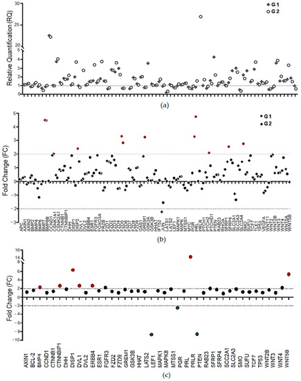 After data normalization, the genes with differential expression among the groups were selected for the next analyses. Considering the relative quantification values (RQs), we found 41 genes in G1 and 50 in G2 with differential expression (Figure 2a). To enhance the biological significance and simplify the validation of the expression results, the cutoff values were increased to <−2 for downregulation and >2 for upregulation.