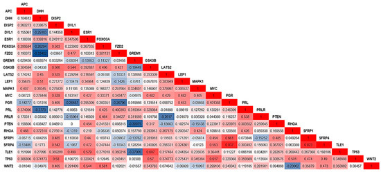 Correlation values (Spearman test) were observed for genes with significant p-values (p < 0.05 and 0.001). The color scale differentiates positive and negative correlation coefficient values: dark blue indicates a negative correlation, and red indicates a positive correlation. Gene names are indicated in the graph, as well as the correlation coefficient values.