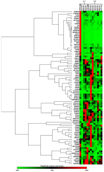Heatmap showing the global gene expression profiles of the 75 sequences (out of 112 included in the chip) evaluated by qRT-PCR, using the open-array (TaqMan® probes and primers) method. G1 = MRSP, G2 = SP, RG = myometrium from G1. Red indicates upregulation, green indicates downregulation, and black indicates no differences between target samples and RG. The color scale bar indicates the grade of significance according to the gene expression value (from −5 to 5) compared to the RG (MM).
