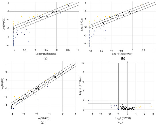 Gene expression profile of the 89 genes evaluated using the array-plate SYBR-green-based method (Qiagen). (a) Scatter plot showing the profile obtained from the comparison between G1 and RG; (b) the profile obtained from the comparison between G2 and RG; (c) the profile obtained from the comparison between G2 and G1; (d) volcano plot showing the profile obtained from the comparison between G2 and G1, considering the significance values. Yellow indicates upregulation, while blue indicates downregulation.