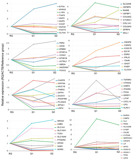 The second method used to analyze the expression profile of genes associated with fertility and endometrial receptivity was the Qiagen array plate, which comprised 89 sequences (Supplementary Table S10). The analyses were performed using 18 LM samples, including 5 from G1, 8 from G2, and 5 from RG. The total RNA of all samples was quantified by spectrophotometric NanoDrop (ND100, Thermo Fisher Scientific, Waltham, MA, USA), and the integrity profile was assessed by electrophoresis on 1% agarose gel. In the reverse-transcription reaction, a First Strand kit RT2 (QIAGEN—SAbiosciences Corporation, Hilden, Germany) was used to transcribe 1 µg of total RNA purified from each sample into cDNA according to the manufacturer’s instructions. The cDNA was subjected to qRT-PCR using a customized PCR array plate, including the sequences of selected genes in the RT2-profile PCR arrays (CLAH-27251A, QIAGEN—SAbiosciences Corporation, Hilden, Germany). Reactions were performed using a 7500 Real-time PCR System (Applied Biosystems, Foster City, CA, USA).