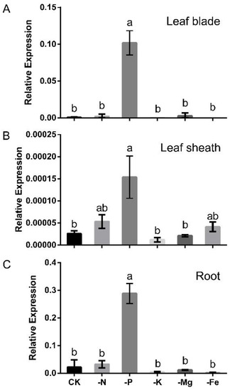 To investigate the expression patterns of OsLPR3 at various nutrient deficiencies, Nipponbare seedlings were initially grown in an IRRI solution for 10 days (10-d-old seedlings). The seedlings were then transferred to a complete nutrient solution (CK) or to a nutrient solution lacking either nitrogen (−N), phosphate (−P), potassium (−K), magnesium (−Mg), or iron (−Fe), and they were grown for 7 d. The relative transcript levels of OsLPR3 in the leaf blades, leaf sheaths, and root samples of the treated seedlings were assessed via a quantitative polymerase chain reaction (qPCR). In CK, the relative transcript levels of OsLPR3 were high in the roots and low in the leaf blades and leaf sheaths. Moreover, most nutrient deficiencies, such as −N, −K, −Mg, and −Fe, did not exert a significant impact on the transcript levels of OsLPR3 compared with CK (Figure 1). The relative transcript levels of OsLPR3 were induced by Pi deficiency in all three plant tissues. In the leaf blades, the relative transcript levels of OsLPR3 were 150-fold higher in −P than in CK (Figure 1A); however, in the roots, the relative transcript levels of OsLPR3 were 13-fold higher in −P than in CK (Figure 1C). Thus, after the induction by −P, the relative transcript levels of OsLPR3 were only three times more abundant in the roots than in the leaf blades. The relative expression of OsLPR3 remained much lower in the leaf sheaths than in the roots and leaf blades after the Pi deficiency induction.