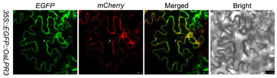 The ER is the entry point for membrane and secretory proteins into the endomembrane system in all eukaryotic cells [31]. It is the site at which these proteins are folded in order to acquire biological functions at their final destination [32]. The protein localization program Softberry (http://linux1.softberry.com/, accessed on 3 September 2022) suggested the putative ER localization of the OsLPR3 protein. For the subcellular localization of the putative ER-targeted proteins, a red fluorescent protein (mCherry) is a potent in vivo marker applicable in diverse plant species [33]. To provide experimental evidence for the ER localization of OsLPR3, a reporter gene encoding a green fluorescent protein (EGFP) driven by a CaMV35S promoter was fused upstream and in frame with the OsLPR3 open-reading frame (35S::eGFP::OsLPR3). This construct was transiently co-expressed with 35S::mCherry::HDEL, which exhibits characteristic red fluorescence in the ER [34] in the leaf epidermal cells of Nicotiana benthamiana. Confocal microscopy was used to demonstrate the co-localization of EGFP::OsLPR3 and mCherry::HDEL to the ER (Figure 2). The co-localization of the two proteins was particularly apparent in the cytoplasmic strands extending across the vacuole (white arrows). The ER localization of OsLPR3 was consistent with the localization of AtLPR1 in Arabidopsis [24].