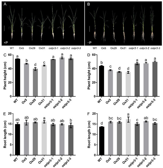 The effects of OsLPR3-Ox and the knockout mutants on the vegetative growth of the 10-d-old rice seedlings grown hydroponically for an additional 21 d under +P and −P conditions were determined. The plant height of the Ox plants was shorter than that of the WT and oslpr3 lines under both +P and −P conditions. The plant height of the oslpr3 lines did not differ from that of WT under +P conditions (Figure 3C). However, under −P conditions, the plant height of the oslpr3 plants was higher than that of WT (Figure 3D). The root length of both the Ox and knockout lines did not differ from that of WT under +P conditions (Figure 3E). However, both the Ox and knockout lines had similarly long roots under −P conditions compared with those of WT (Figure 3F). The effects of the OsLPR3-Ox and knockout lines on the biomass and root–shoot ratio were also determined. The shoot and root biomasses of the OsLPR3-Ox plants were repressed under both +P and −P conditions, but no significant differences were observed between their root–shoot ratio and that of WT (Figure S2). The shoot biomass, root biomass, and root–shoot ratio of the oslpr3 lines were not significantly different from those of WT under +P conditions (Figure S2A,C,E). However, under −P conditions, both the shoot biomass and root biomass were increased in the oslpr3 plants, and they were ~54% and ~24% higher in the transgenic plants than in the WT plants, respectively. In addition, the root–shoot ratio was ~22% lower in the oslpr3 mutants than in WT (Figure S2B,D,F).