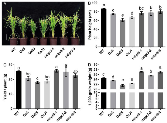 OsLPR3 affects growth performance and reproductive traits. WT, OsLPR3-Ox, and oslpr3 lines were grown to maturity (20 weeks), (A) Photographs of the plant phenotypes. Scale bar = 20 cm. (B–D) Plant height, plant yield, and 1000-grain weight, respectively. Values are means ± SE (n = 10). Different letters above the bars indicate significant differences (p < 0.05, one-way ANOVA).