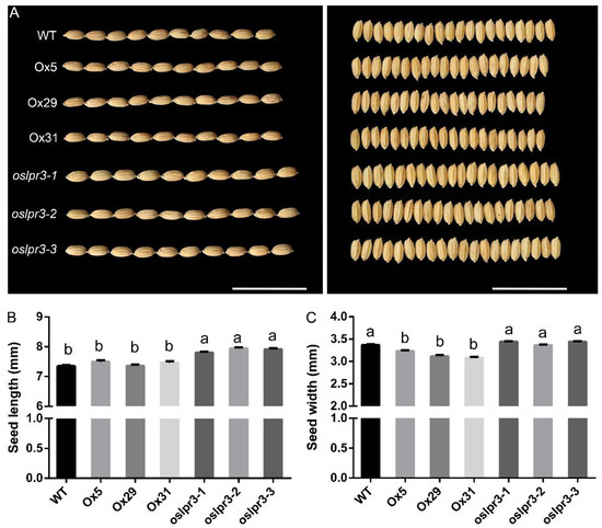 Alteration of OsLPR3 expression affects seed length and width. WT, OsLPR3-Ox, and oslpr3 lines were grown as described in the legend in Figure 6. (A) Photographs of the seed phenotype. Scale bar = 3 cm. (B,C) Seed length and seed width, respectively. Values are means ± SE (n = 30). Different letters above the bars indicate significant differences (p < 0.05, one-way ANOVA).