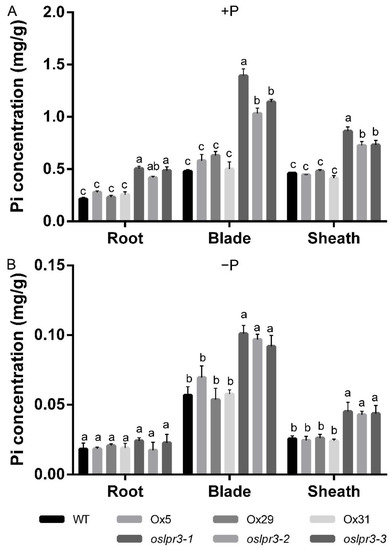 Furthermore, the oslpr3 mutation increased the total P concentration of the rice under +P conditions, and the 32P-isotope-labeling assay further confirmed that the Pi uptake rate of the oslpr3 mutants was higher than that of WT, which might be because the OsLPR3 knockout stimulated the expressions of OsPT2, OsPT4, OsPT8, and OsPT10 in the rice (Figure S6). Under −P conditions, the total P concentration and Pi uptake rate of the oslpr3 mutants were not significantly different from those of WT. However, the oslpr3 mutants showed a high tolerance to low Pi stress. The increased soluble Pi content of the oslpr3 mutant lines might have led to the high tolerance to low Pi stress in the oslpr3 mutants.