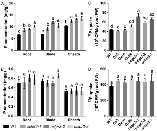 Total P concentration in oslpr3 lines. (A,B) Seedlings (10-d-old) of WT and oslpr3 lines were grown hydroponically under +P (A) and −P (B) conditions for 21 d. The total P concentration was determined in roots, leaf blades, and leaf sheaths. Values are means ± SE (n = 5). (C,D) Seedlings (10-d-old) of WT, OsLPR3-Ox, and oslpr3 lines were grown hydroponically under +P (C) and −P (D) conditions for 7 d. The 32Pi uptake over 3 h was determined in WT and OsLPR3 transgenic lines. Values are means ± SE (n = 4). Different letters above the bars indicate significant differences (p < 0.05, one-way ANOVA).