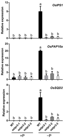 To determine the function of OsLPR3 in Pi homeostasis, the expressions of the relative genes that maintained Pi homeostasis were explored in the OsLPR3 knockout lines and WT. The expression levels of the Pht1 family members were assessed in the roots of the WT and oslpr3 lines under +P conditions. The transcript levels of OsPT2, OsPT4, OsPT8, and OsPT10 were significantly higher in the oslpr3 mutants than in WT, whereas the transcript levels of OsPT1, OsPT6, and OsPT9 were not significantly different between the oslpr3 mutants and WT (Figure S6). Further, the relative expression levels of Pi-starvation-inducible genes, including OsIPS1, OsPAP10a, and OsSQD2, were determined in the roots of the WT and oslpr3 lines under +P and −P conditions. The relative expression levels of OsIPS1, OsPAP10a, and OsSQD2 in the oslpr3 mutants were not significantly different from those in WT under +P conditions. Under −P conditions, the relative expression levels of OsIPS1, OsPAP10a, and OsSQD2 in the oslpr3 mutants were severely repressed compared with those in WT. The relative expressions of OsIPS1, OsPAP10a, and OsSQD2 were highly induced in response to Pi deficiency in WT, which is consistent with a previous study [35]. Notably, the relative expression levels of OsIPS1, OsPAP10a, and OsSQD2 in the oslpr3 mutants were only a little higher under −P conditions than under +P conditions, but the relative expression levels of these genes were far higher in WT under −P conditions than under +P conditions (Figure 8).