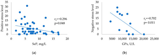 Correlations between selenium parameters and stressful events in HT and GD patients: (a) Correlation between SeP and positive stress levels in HT patients. (b) Correlation between GPx and negative stress levels in patients with GD.