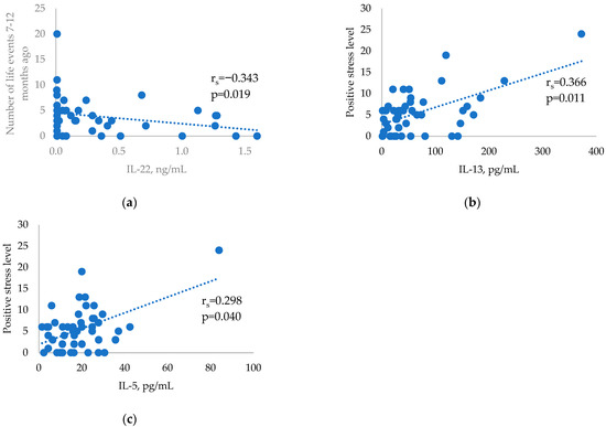 Correlations between selected cytokines and stressful life events in the HT and control groups: (a) Correlation between IL-22 and stressful life events occurring 7–12 months before HT diagnosis. (b) Correlation between positive stress levels and IL-13 in the control group. (c) Correlation between positive stress levels and IL-5 in the control group.