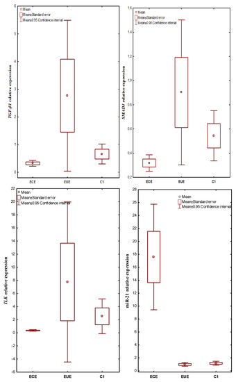 2.1. The Expression Profile of TGF-ß1, SMAD3, ILK and miR-21 in Ectopic Lesions (ECE), Eutopic Endometrium (EUE) vs. Control Endometrium (C1)