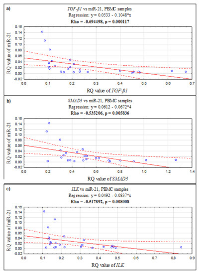 2.3. Correlations between the Expression Level of TGF-ß1, SMAD3, ILK and miR-21 in 3 Different Biological Materials (Ectopic Endometrium–ECE, Eutopic Endometrium–EUE, and PBMCs) Obtained from the Same Patient with Endometriosis