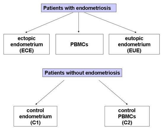 - Johnson, M.C.; Torres, M.; Alves, A.; Bacallao, K.; Fuentes, A.; Vega, M.; Boric, M.A. Augmented Cell Survival in Eutopic Endometrium from Women with Endometriosis: Expression of c-Myc, TGF-Beta1 and Bax Genes. Reprod. Biol. Endocrinol. 2005, 3, 45. [Google Scholar] [CrossRef]