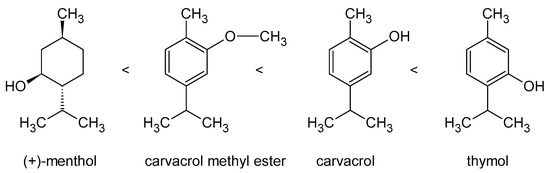 The co-occurrence of –OH groups and the electron delocalization system (in the form of double bonds in the ring) is important here. The lack of this second “element” of the molecular structure, as in menthol molecule, prevents the detachment of the proton from the –OH group and makes the antimicrobial activity much lower (Figure 1). Additionally, ring rupture weakens the antibacterial potential, which is why geraniol and nerol are much weaker inhibitors of bacterial growth than carvacrol or thymol [139,155].