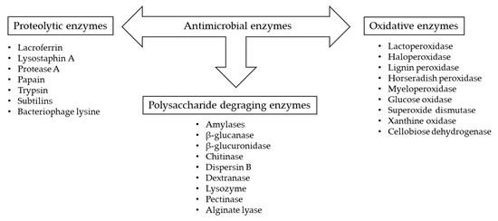 Enzymes are increasingly used as antimicrobial agents in food due to their ability to inhibit bacterial biofilm formation, either direct attacking the microorganisms and/or undergoing catalyzing reactions that result in formation of antibacterial compounds. There are three main groups of enzymes with antimicrobial and antibiofilm potential (Figure 2) [215].
